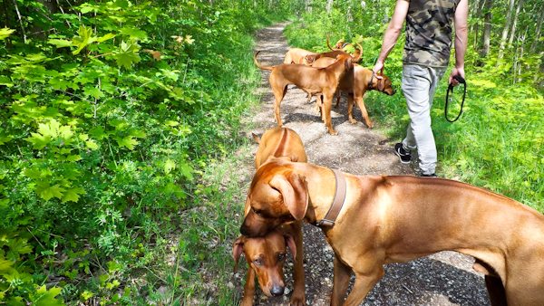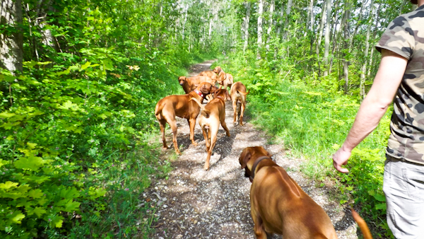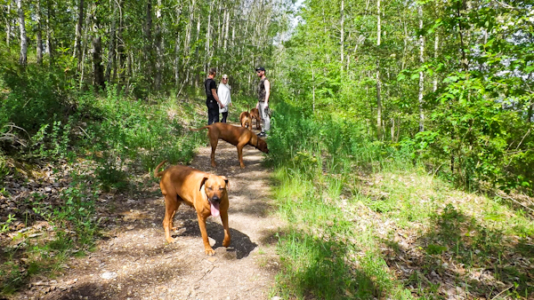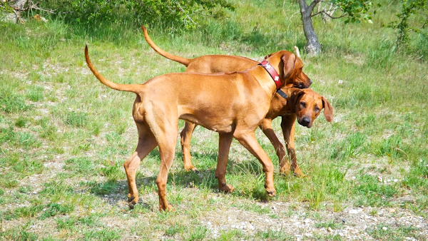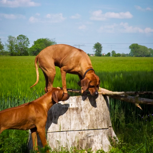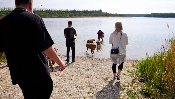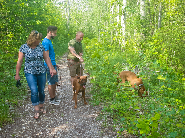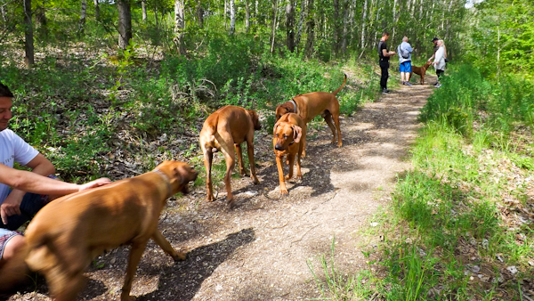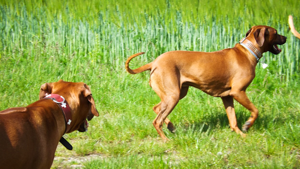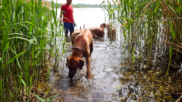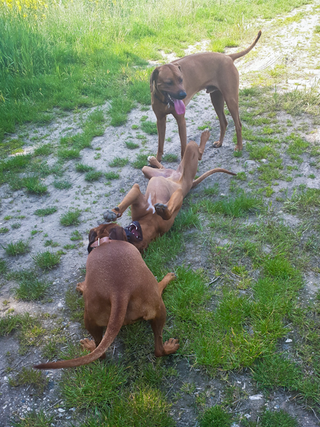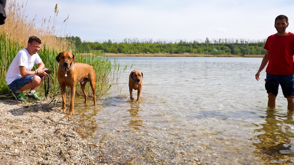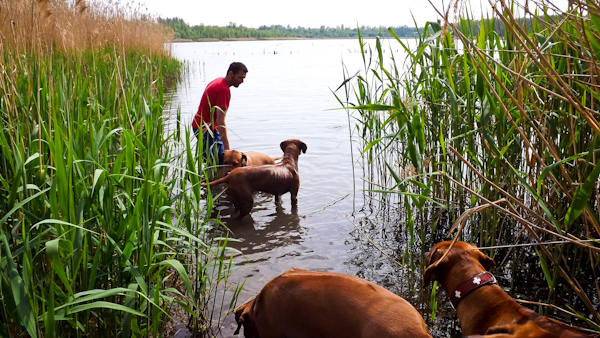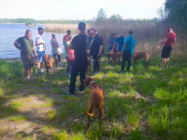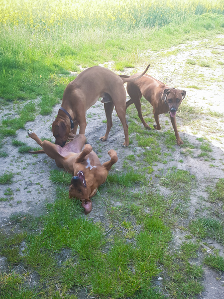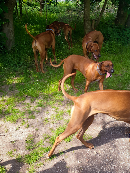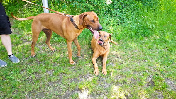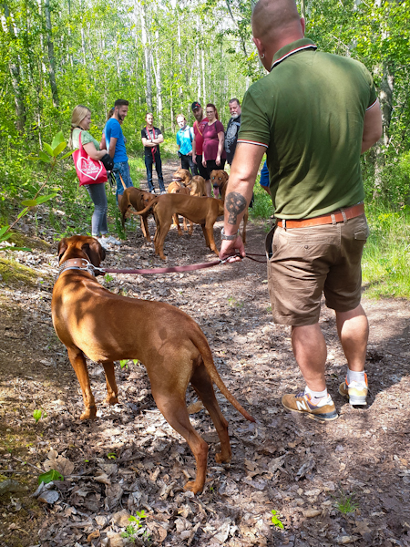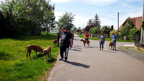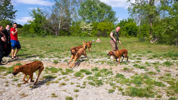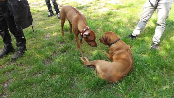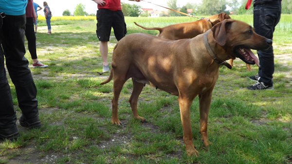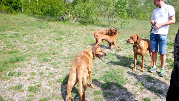 Frank Behnke von der Bennewitzer Hundeschule, selbst Besitzer von zwei Ridgebackrüden, erzählte von seinen Erfahrungen mit der Rasse und gab Auskunft bei Fragen der Anwesenden. Natürlich wollten die Rüden gern alle den Chef rauskehren und die Hündinnen demonstrierten ihre ganz individuellen Techniken, mit den Avancen des anderen Geschlechts umzugehen.